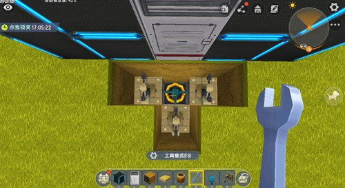 拿出蓝色电能线连接左右以及后方的草块,将三个草块最后连接火药桶的中心点位置。三个蓝色电能线上方再覆盖上推拉机械臂,用扳手给每个推拉机械臂激活,这样可以让机械臂的长度增加。