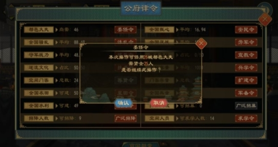 在公府律令界面找到 【委任令】 ,便可对已有的所有城池进行一键任命,系统将自动派遣门舍中的人才到各地担任该职责。