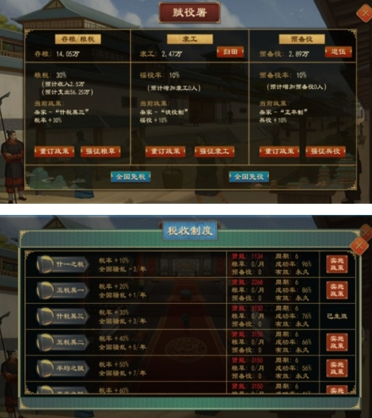 在“游戏界面右侧切换都城视图-计府”中找到 【赋役署】 ,点击存粮/粮税内的【重订政策】,选择【什税其三】,并点击实施政策即可自动施行,完成政策需要一定时间。