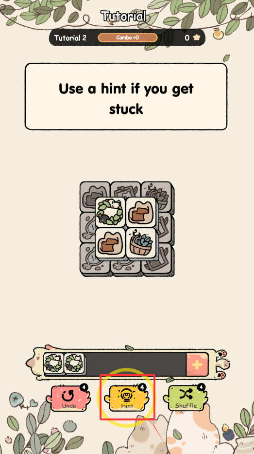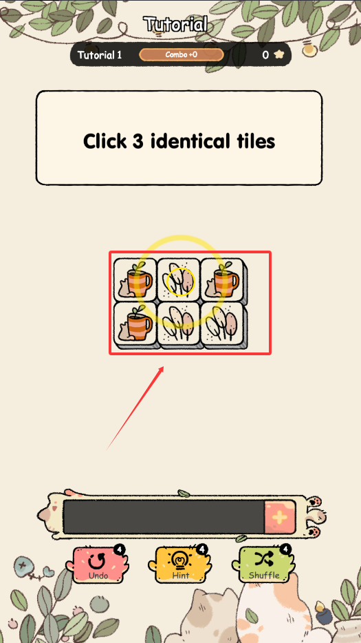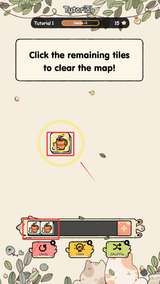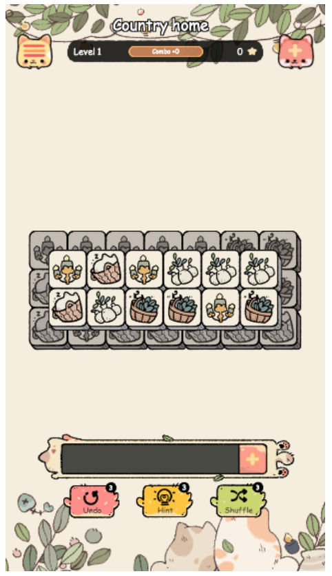 1、观察牌面布局,点击上方卡牌移入底部暂存区,凑齐三张相同卡牌自动消除,清空牌面完成关卡。