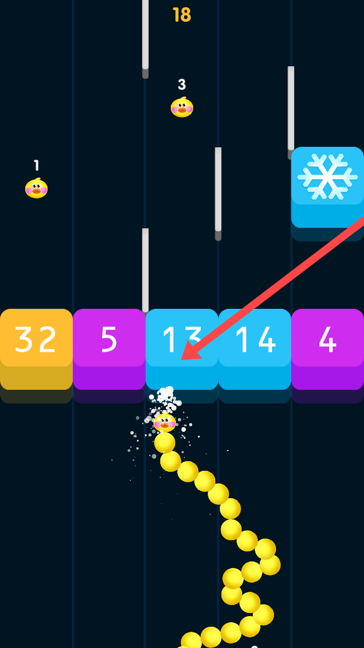 2、陷阱密布策略为王:彩色方块不仅是收费关卡,触碰还会短时间吸走大量豆子,小额数字方块被包围形成陷阱阵,需权衡吃豆路线,在快速移动躲避高消耗方块。