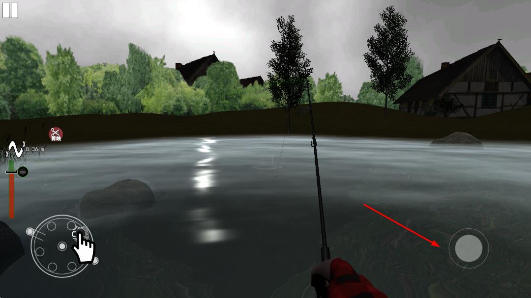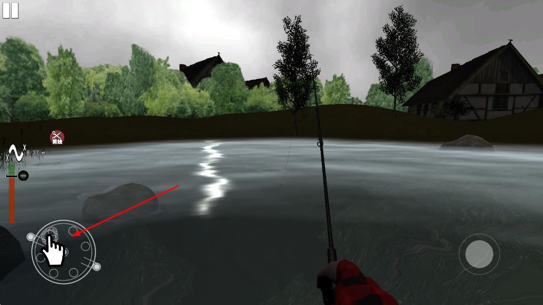 3、左下角可以在钓上鱼之后把线卷回来。