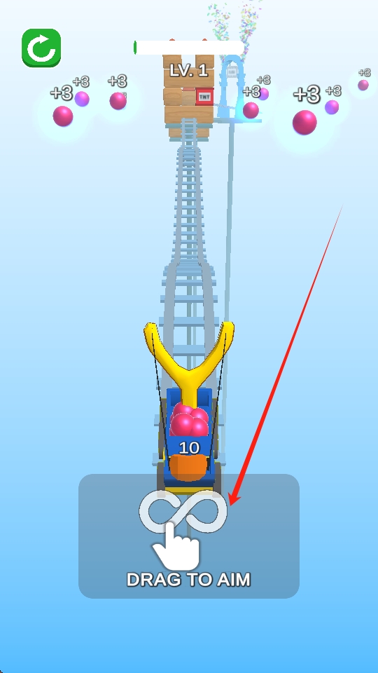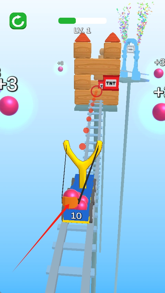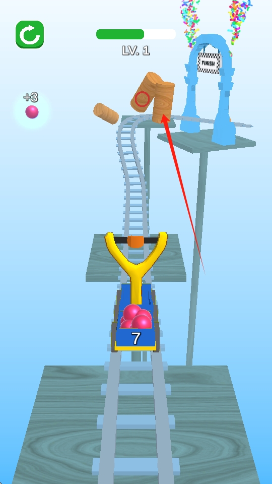 1、持弓发射目标物:玩家手持弹弓,发射红色目标物,开始关卡挑战,通过控制发射的力度和角度,努力完成关卡任务。