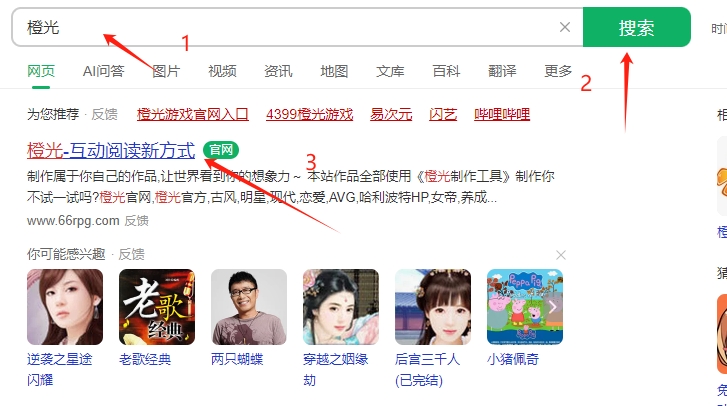 1、在网站上搜索橙光,点开链接。
