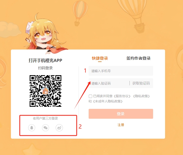 2、登录或注册账号,进入橙光。