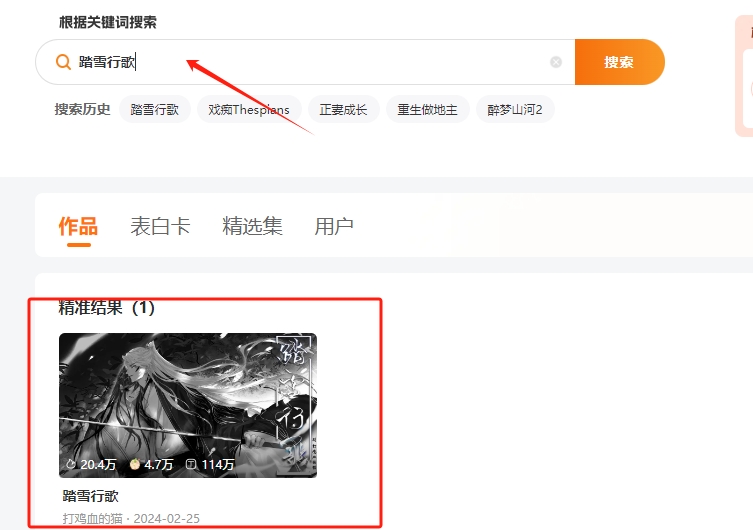 3、在搜索栏上搜索游戏名,点开作品即可。