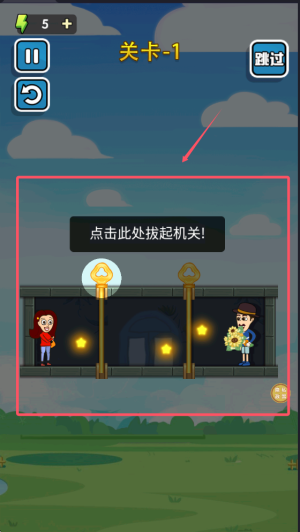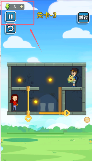 1、进入游戏后,有铁杆阻拦两个情侣,我们需要按照指示抽取栏杆促其碰面。