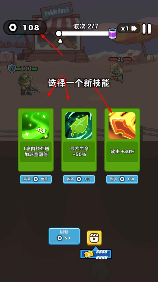 3、技能选择提升:完成上述操作后可选择技能,通过击杀怪物爆小球来购买技能,不断提升自身实力。