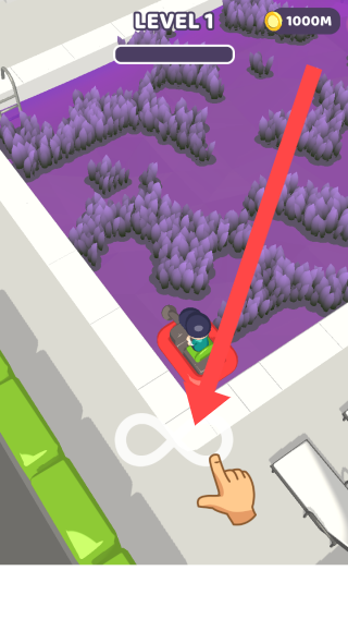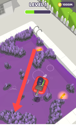 3、在充满紫色植被的泳池场景里,沿着箭头指引收集金币,同时留意避开障碍物以顺利推进游戏。