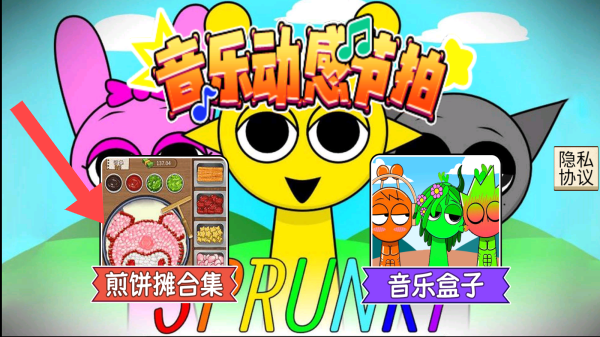 1、画面中有多个卡通形象,两种模式供玩家选择,搭配音符和星星装饰,呈现出游戏开始前的界面元素。