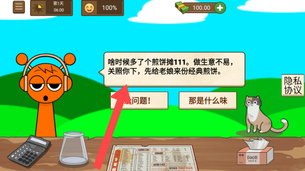 2、下方桌面上有计算器、透明量杯、菜单、纸巾盒等物品,整体呈现出经营类游戏的场景,在向玩家下达制作经典煎饼的需求。