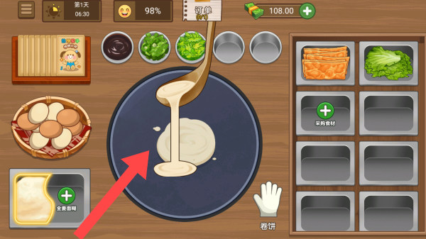 3、画面中间是一口大锅,木勺正在向锅中倒入面糊,呈现出制作煎饼的操作场景,玩家在进行制作经典煎饼的步骤。