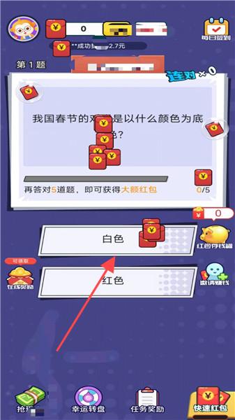 1、看到题目“我国春节的对联是以什么颜色为底?”,点击【红色】选项,这是正确答案。