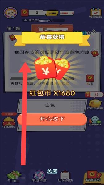 3、显示“恭喜获得红包币”后,点击【开心收下】,完成奖励收取,攒够一定数量可以提现。