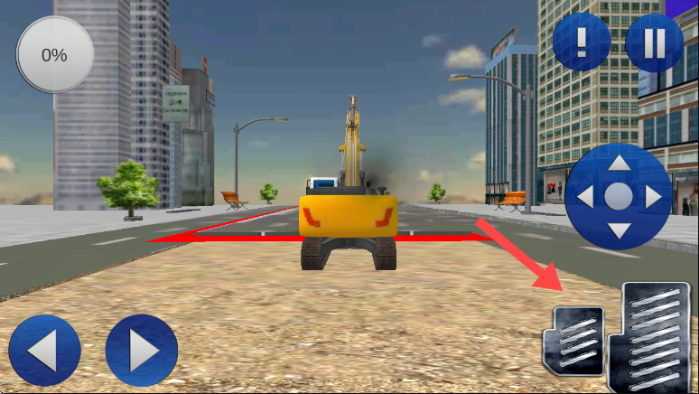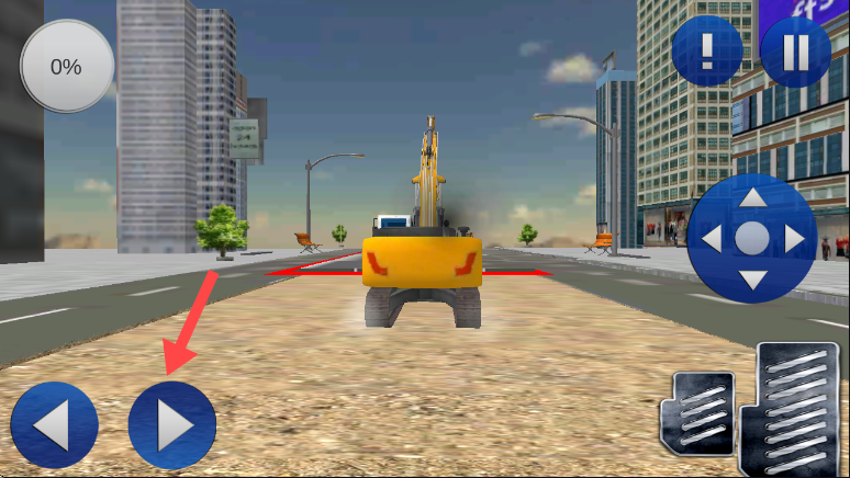 2、点击左下角【蓝色箭头按钮】,操控挖掘机向前移动,熟悉基础的移动操作。