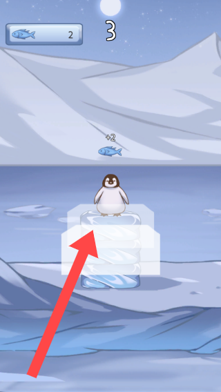 2、根据冰块移动的方向让企鹅向上跳跃,显示小鱼数量慢慢增加,通过点击控制企鹅跳跃来收集小鱼等元素。
