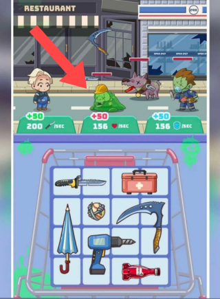 3、下方是购物车样式的格子,内含刀、伞、电钻等物品图标,玩家在下方收集物品,用于对抗上方角色或敌人。