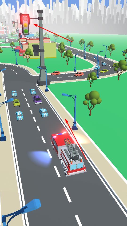 1、点击屏幕可以使前面的红绿灯更改信号,使消防车和前面的小车通过,小车先过,消防车会自动跟在后面。