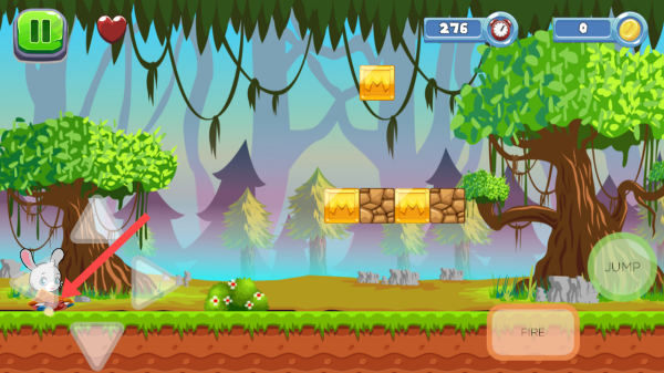1、点击主角超级兔子使用屏幕上的上下左右按键进行操作,遇到小怪时可以点击右下角跳跃踩它。