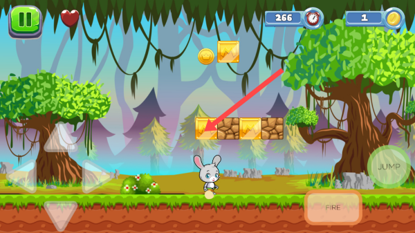 2、在空中主角前进的时候,遇到金色格子可以点击我们的主角兔子跳跃顶掉格子上的金币。