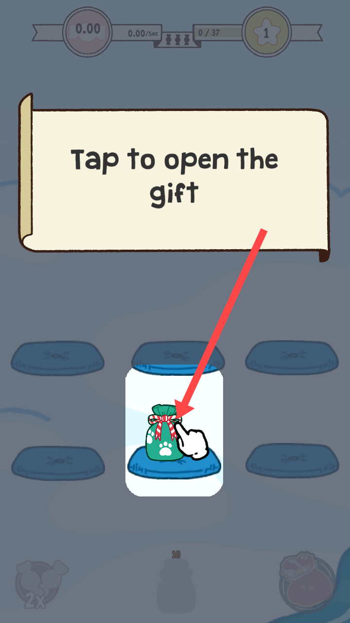 1、进入游戏界面,看到提示【Taptoopenthegift】,点击图示绿色礼物袋,开启礼物获取环节。