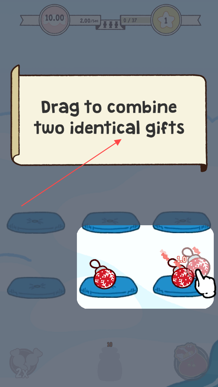 2、接着出现提示【Dragtocombinetwoidenticalgifts】,按要求拖动两个相同礼物进行合并操作,推进游戏进程。