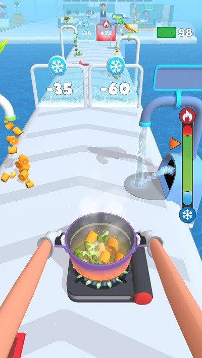 2、温度控制机制:不同食材对温度要求各异,需通过道路上的温度区域调节火候,精准把握加热时机,避免食材过熟或夹生,考验玩家反应能力。