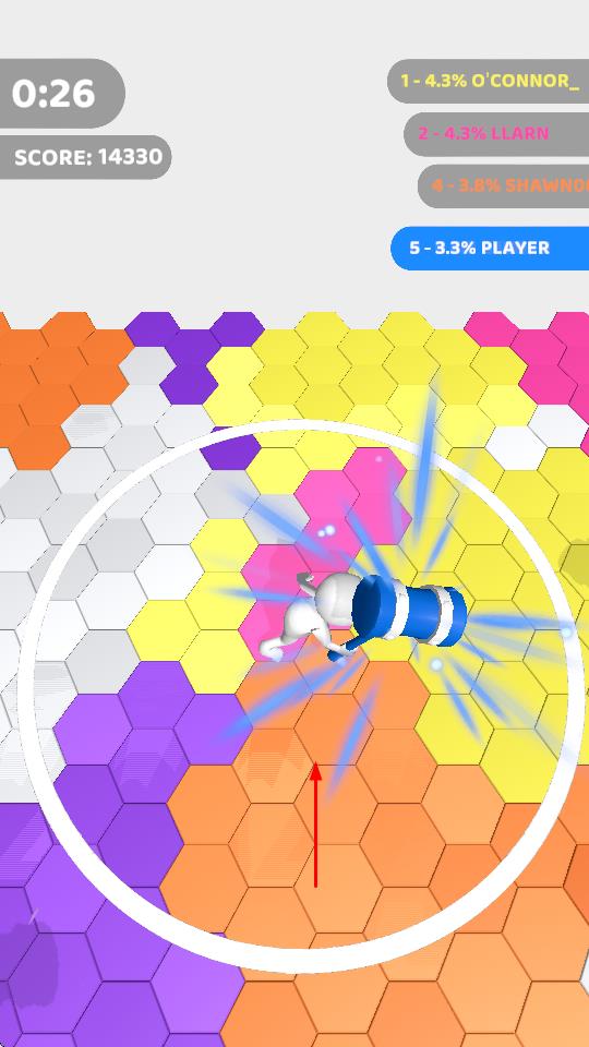 1、点击开始游戏,滑动屏幕控制人物移动,点击可以挥舞大锤砸下地,砸出一片属于自己的颜色区域,