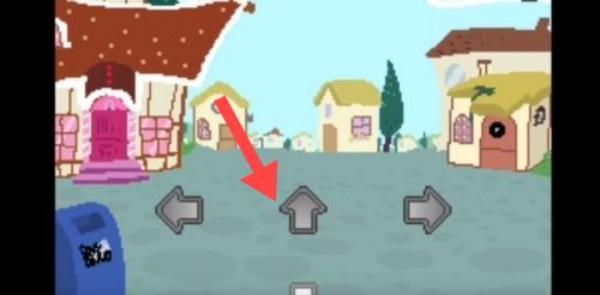 3、在场景移动界面,点击【箭头】所指的向上箭头按钮,操控角色向前移动,探索游戏场景。