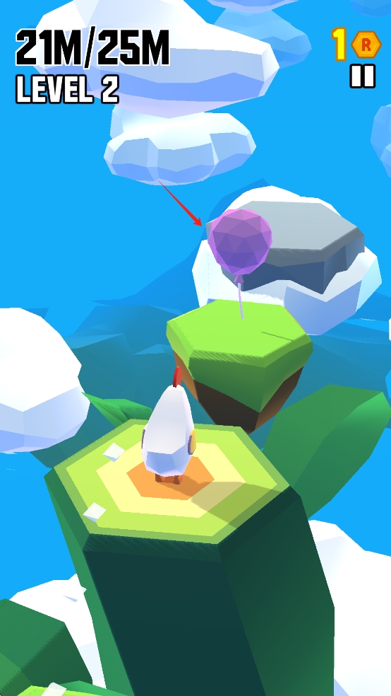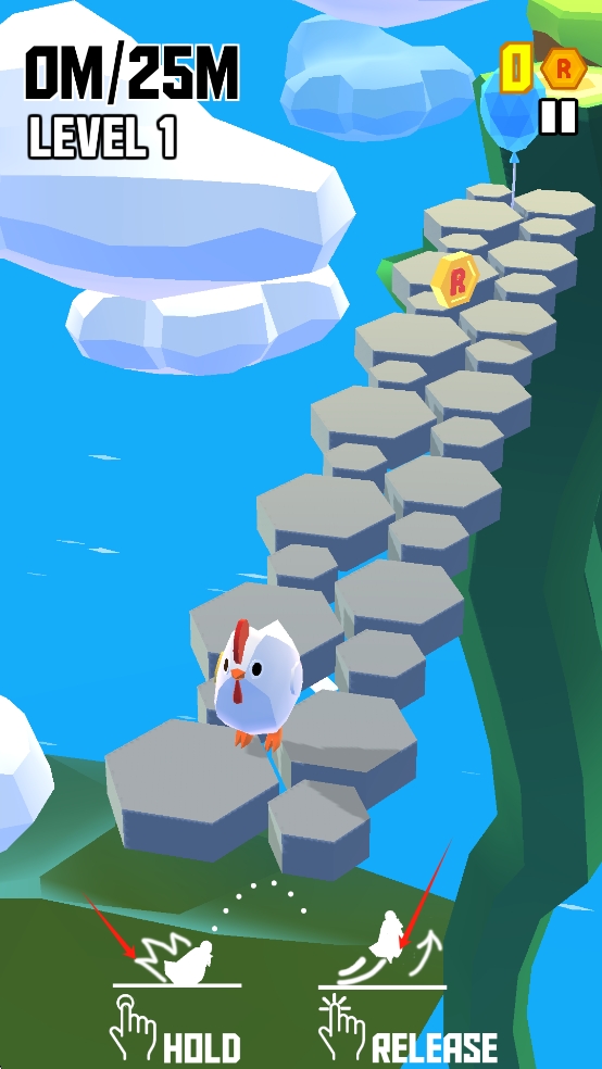 1、触屏力度控制:长按屏幕任意位置蓄力,观察力度条变化调整跳跃力度,松开后小鸡按对应力度跳跃,需根据前方空岛间隔与障碍高度,在短按轻跳与长按远跳切换。