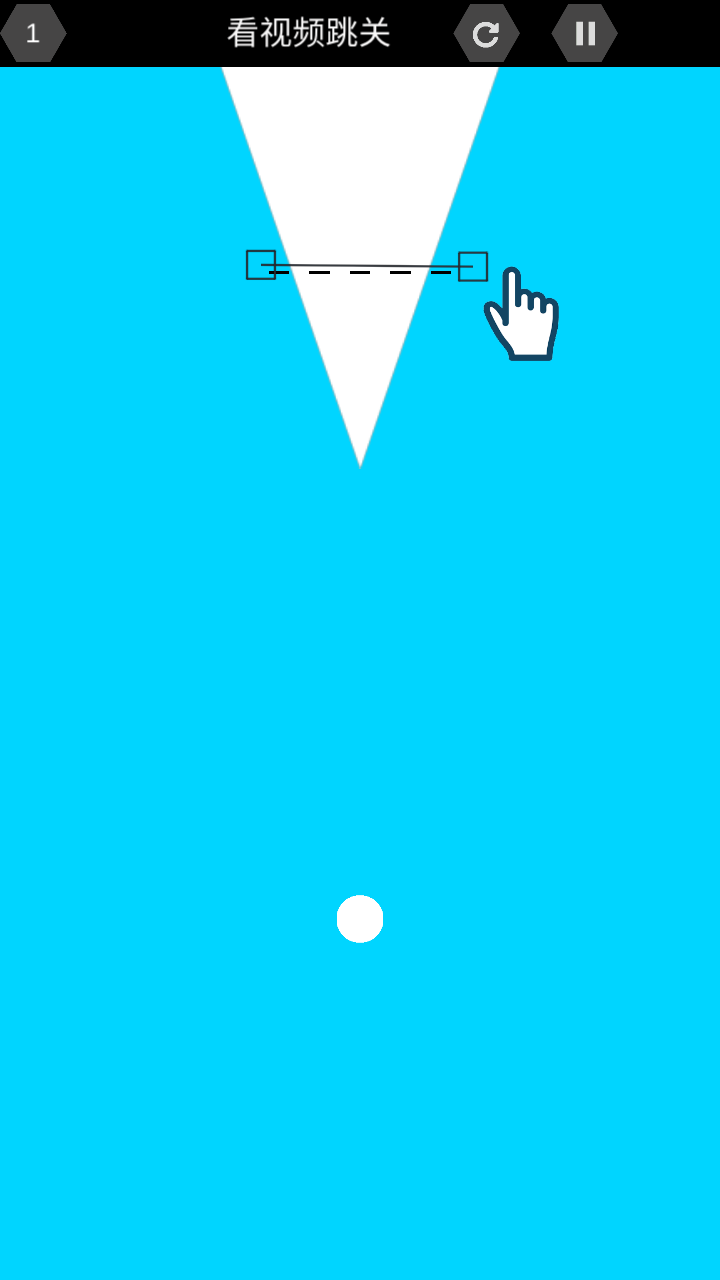 2、进入关卡1,观察蓝色背景中白色三角形结构,按虚线提示滑动手指切割或调整路径,引导白球移动,熟悉基础操作。