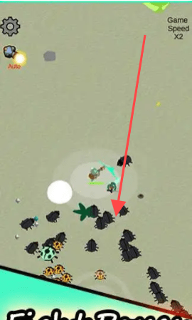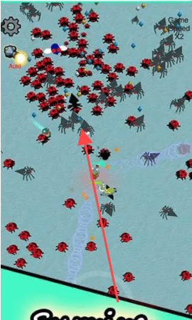 1、在游戏操控角色按红色箭头方向移动,躲避大量红色瓢虫等怪物的包围,利用角色技能或道具突出重围。