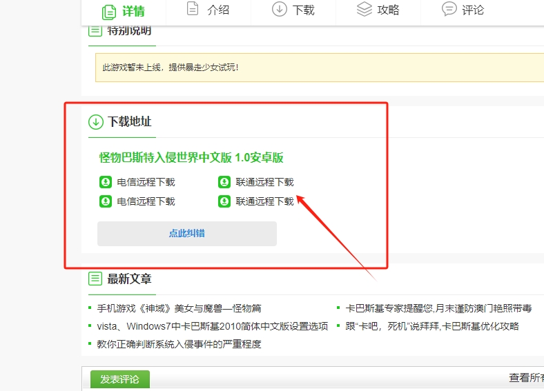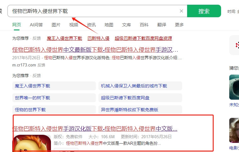 1、在网站上搜索怪物巴斯特入侵世界下载,并点击图片标记的链接进去下载。