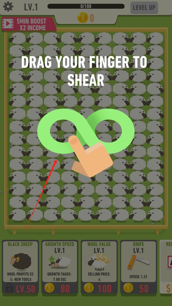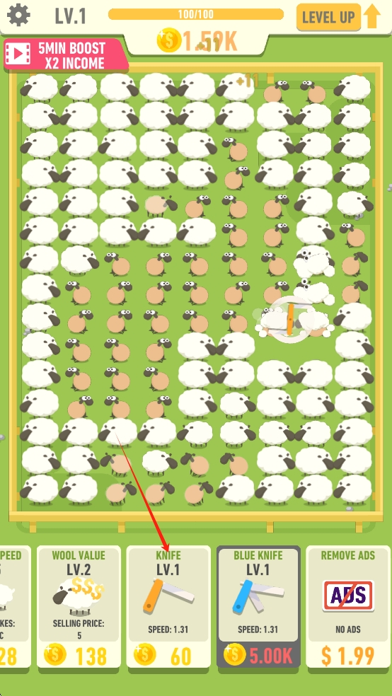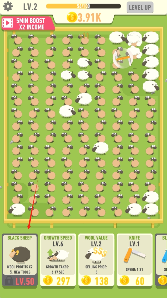 3、不停地收集羊毛赚钱,给羊,修剪刀,以及羊毛的价值升级,升级到50级之后,可以购买更贵的羊。