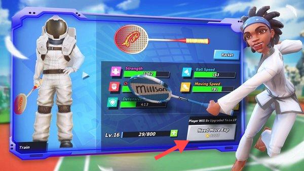 2、角色养成资源管理:通过参加比赛获取训练卡体验卡等资源,用于提升角色的进攻防守等基础能力,同时收集不同属性的球拍和特色服装。