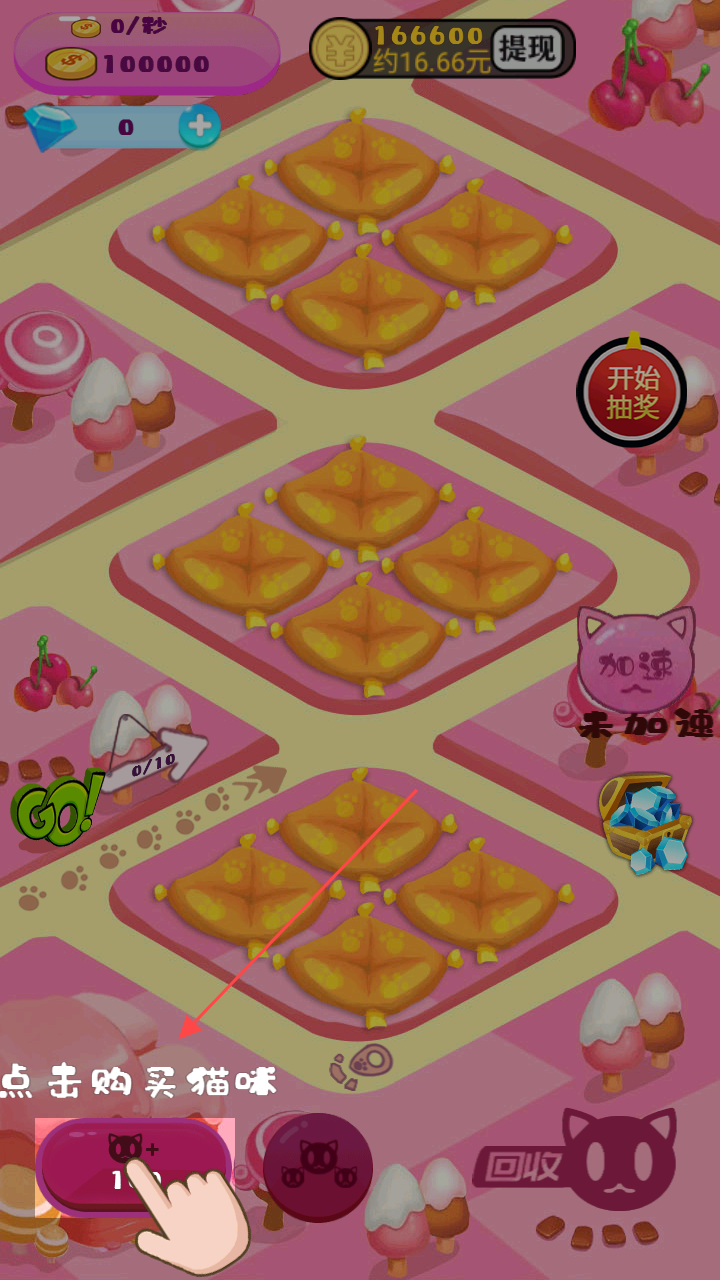 1、点击界面左下角【点击购买猫咪】按钮(如“+1”按钮),消耗金币购买猫咪,这是游戏的初始操作,积累猫咪数量。
