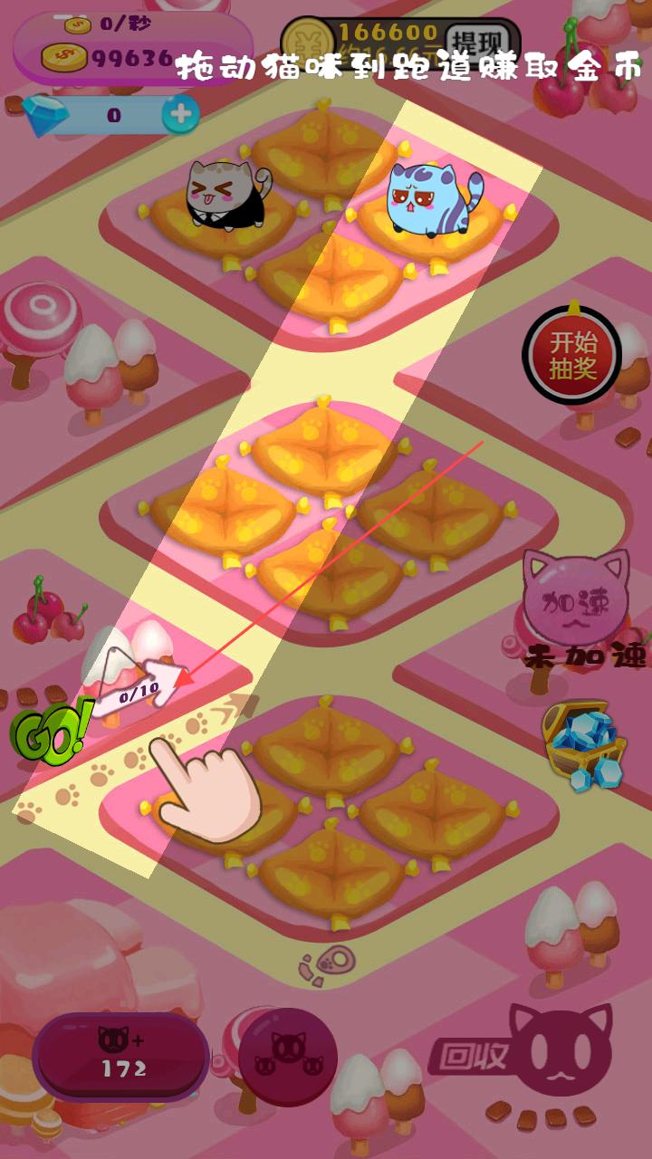 3、将升级后的猫咪按【拖动猫咪到跑道赚取金币】提示,拖至跑道区域,猫咪会自动赚取金币,持续积累游戏货币,体验游戏核心玩法。