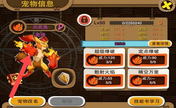 3、对于炎武兔宠物,依据其【超级爆破】【定点爆破】等技能情况,合理安排技能书学习,提升技能等级,增强宠物整体实力。