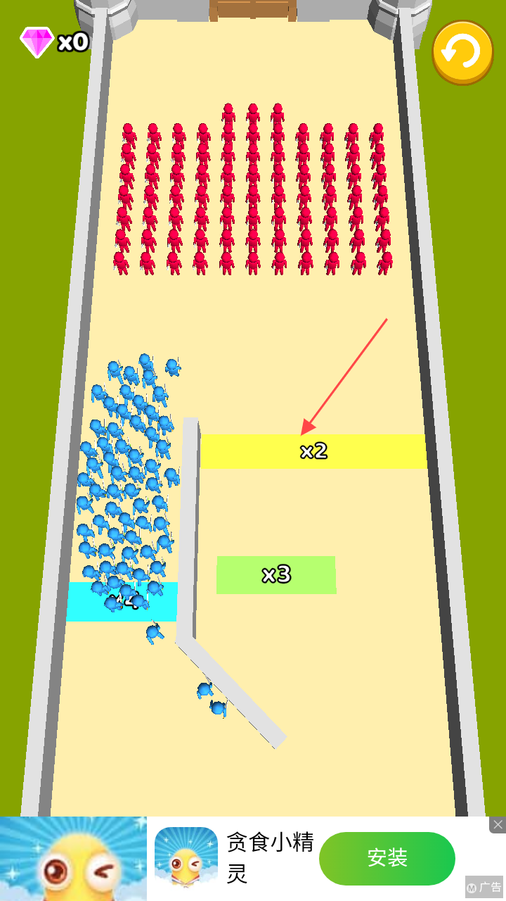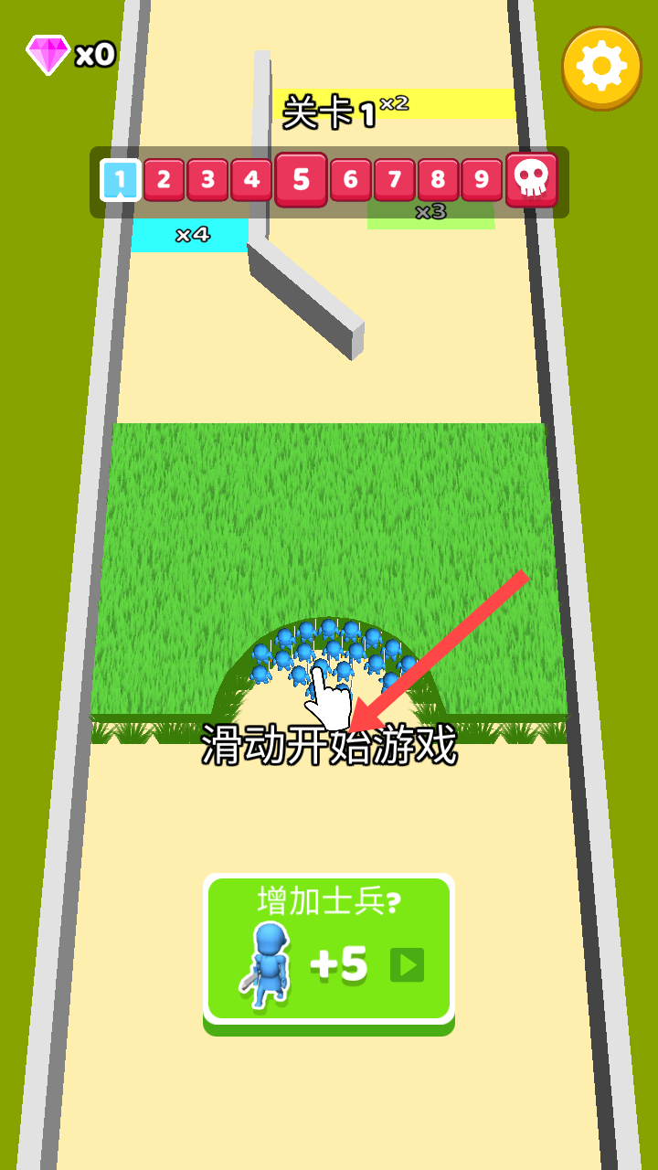 2、游戏过程中,操控蓝色士兵前进,经过【×2】等倍数区域,扩大士兵队伍规模,增强战斗实力。