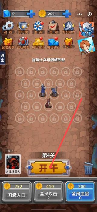 2、在阵容调整界面,拖动士兵调整阵型,确认后点击【开干】按钮(箭头所指)进入第4关,同时可根据需求点击【升级人口】等按钮提升战力。