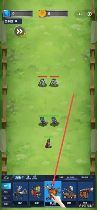 1、进入游戏界面后,点击底部【角色图标】(如箭头所指的“凡圣”),选择出战角色,准备抵御前方敌人,这是战斗准备的关键操作。