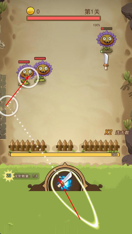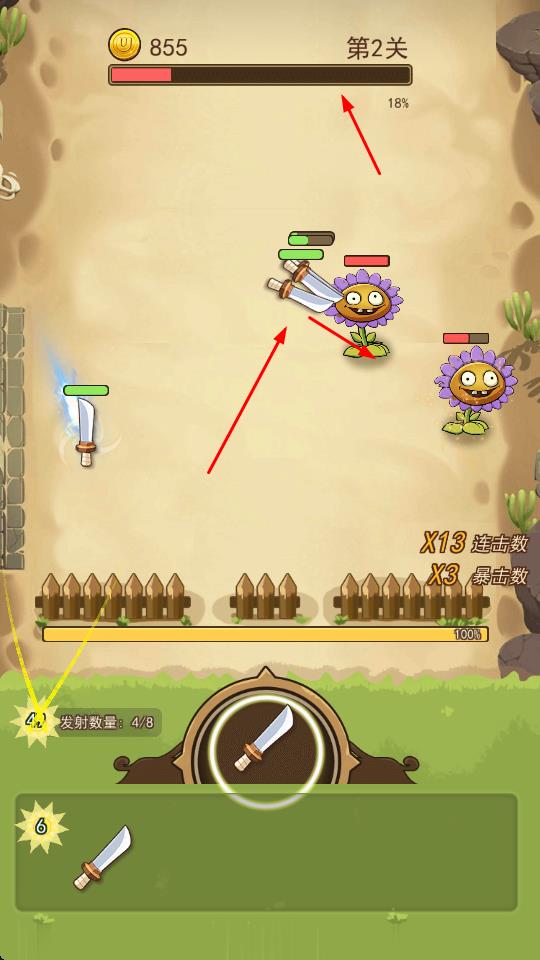 1、玩家操控飞刀发射,瞄准并击中场景中的怪物(如紫色花朵怪物),通过有限的发射次数完成关卡目标。