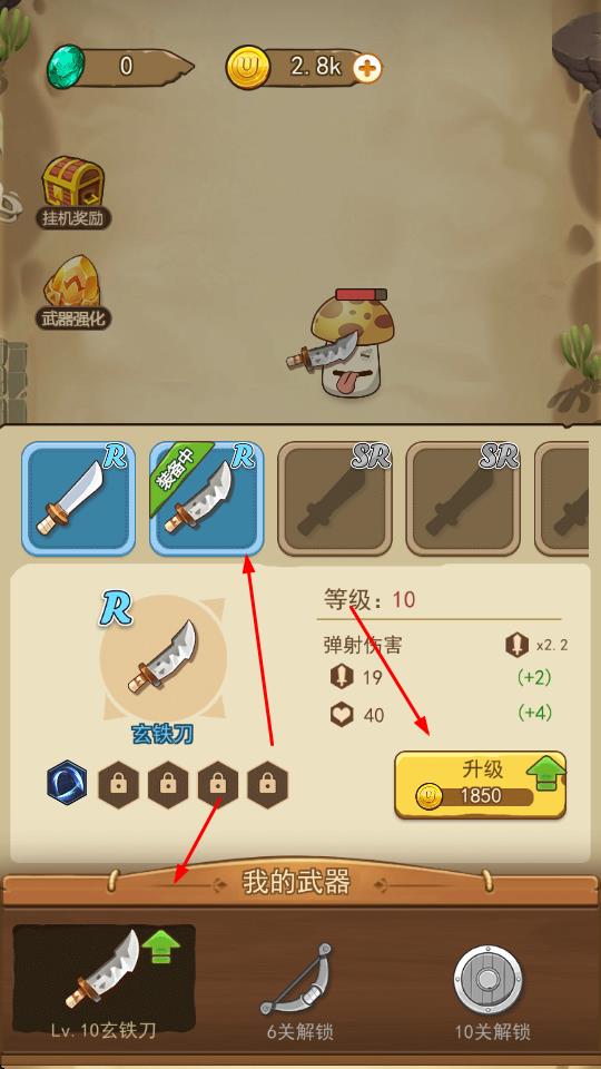 3、玩家可使用金币对武器(如玄铁刀)进行升级,提升弹射伤害等属性,还能解锁新武器,增强游戏实力。