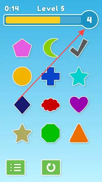 2、在【Level5】等关卡中,关注顶部的时间及进度条(如显示4),集中注意力快速选择正确图形,确保符合游戏要求。