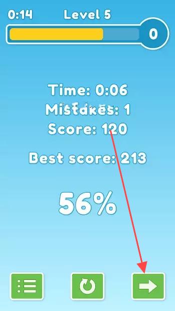 3、完成关卡后,查看等结果信息,点击箭头所指的绿色【右箭头按钮】,进入下一关卡,持续体验游戏挑战。
