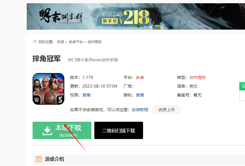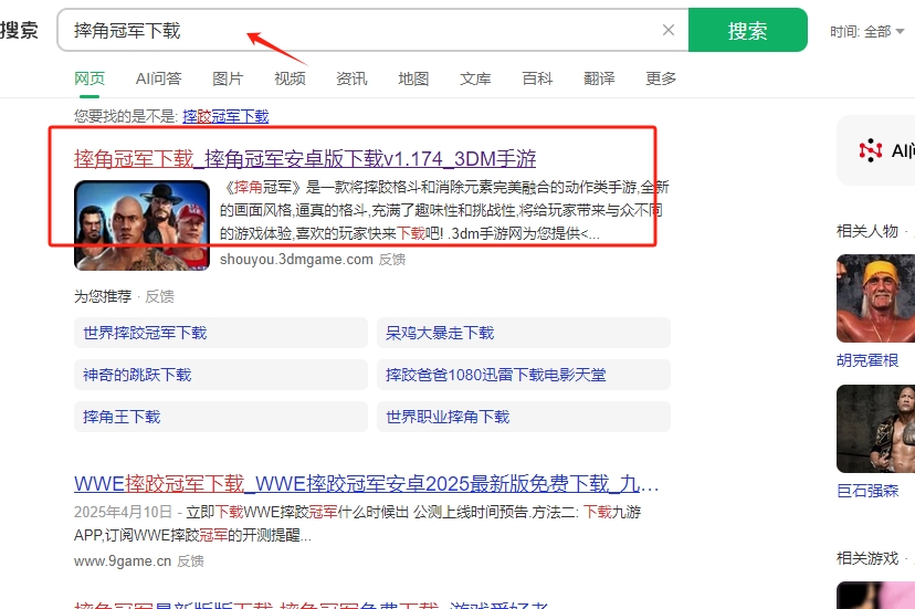 1、在网站上搜索摔角冠军下载,并点击图片标记的链接进去下载。