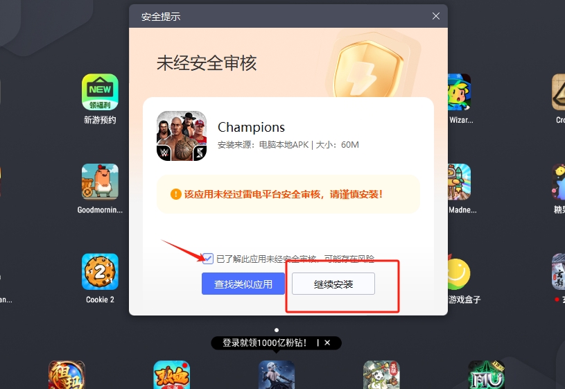 3、将摔角冠军apk拖入到雷电模拟器,点击已了解此应用,再点击继续游戏即可进入游玩。
