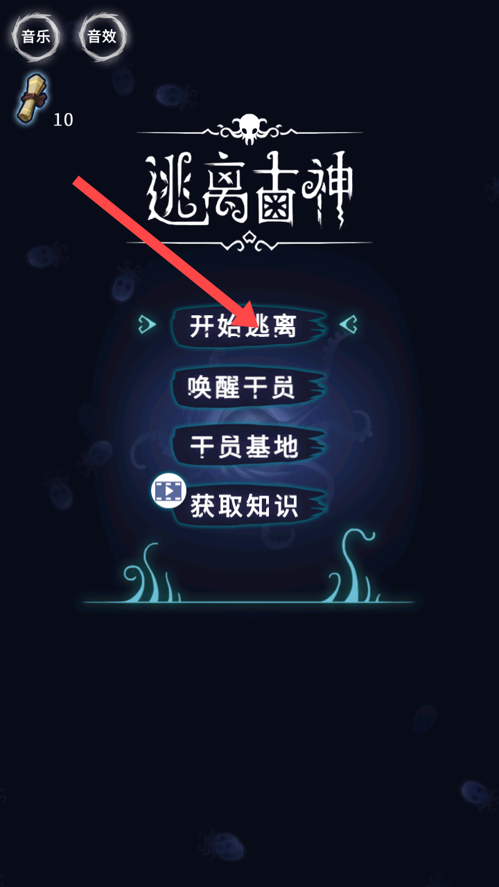 1、在进入游戏主界面后,你需要点击【开始逃离】按钮,进入逃离古神的游戏游玩环节。