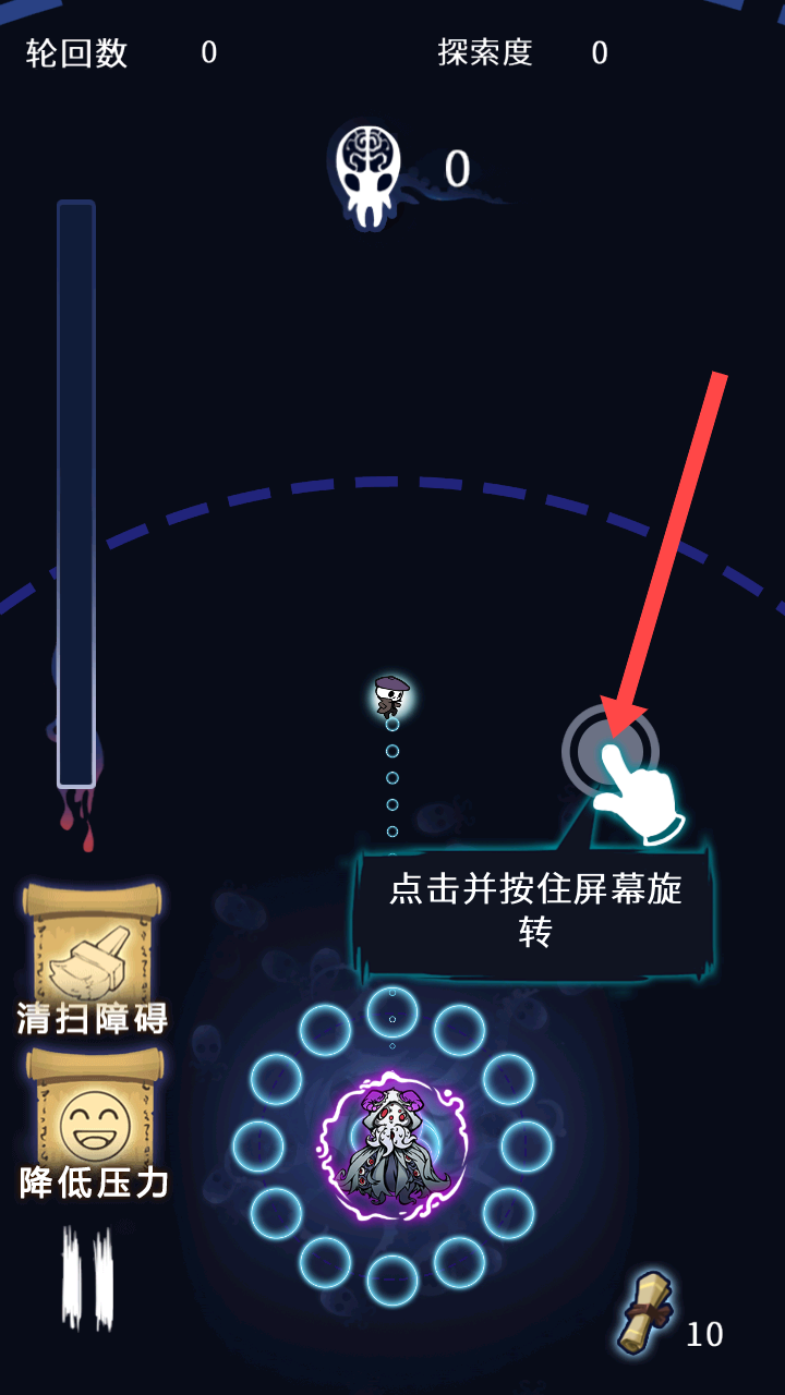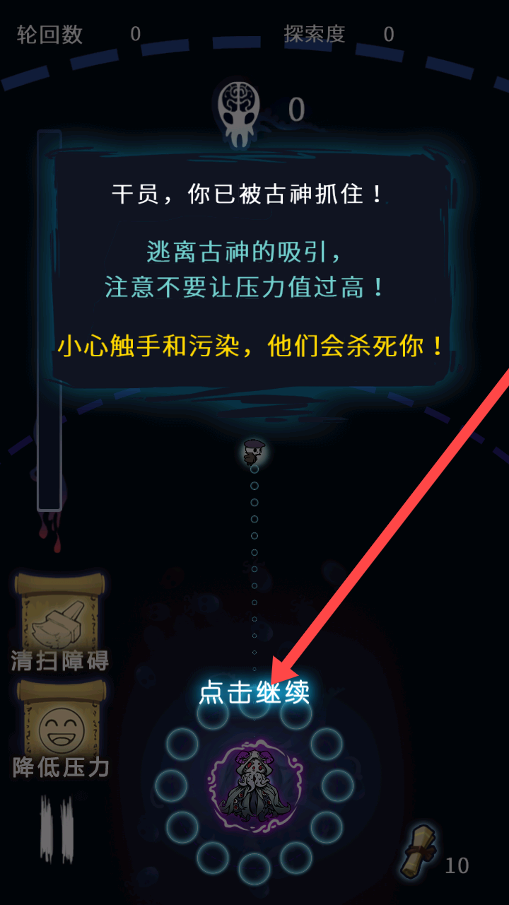 3、根据操作提示【点击并按住屏幕旋转】,以应对游戏中的互动环节,避免被古神抓住,同时注意压力值。