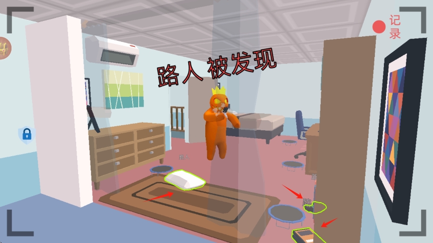 3、游戏开始后,橙色小人会出来抓人,箭头所指,物体周边发着光的是路人队友,我们要注意躲藏。